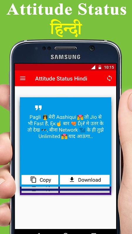 Diese App bietet Ihnen den besten Einstellungsstatus in Hindi für 2024. Zeigen Sie Ihre Einstellung und Persönlichkeit mit diesem Einstellungsstatus auf Hindi. Bei diesen kurzen coolen Einstellungsstatus für WhatsApp handelt es sich um Hindi-Nachrichten, die als SMS gesendet oder als WhatsApp-Status festgelegt oder auch als neuer WhatsApp-Bildstatus verwendet werden können.