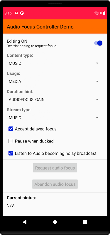 AudioFocusController ist eine Android-Bibliothek, mit der Sie Audio Focus in Ihrer App mit minimalem Code verwalten können. Diese App zeigt nicht nur die Verwendung der Bibliothek, sondern ist auch hilfreich, um zu testen, ob sich Ihre App korrekt verhält, wenn sie den Audiofokus verliert.