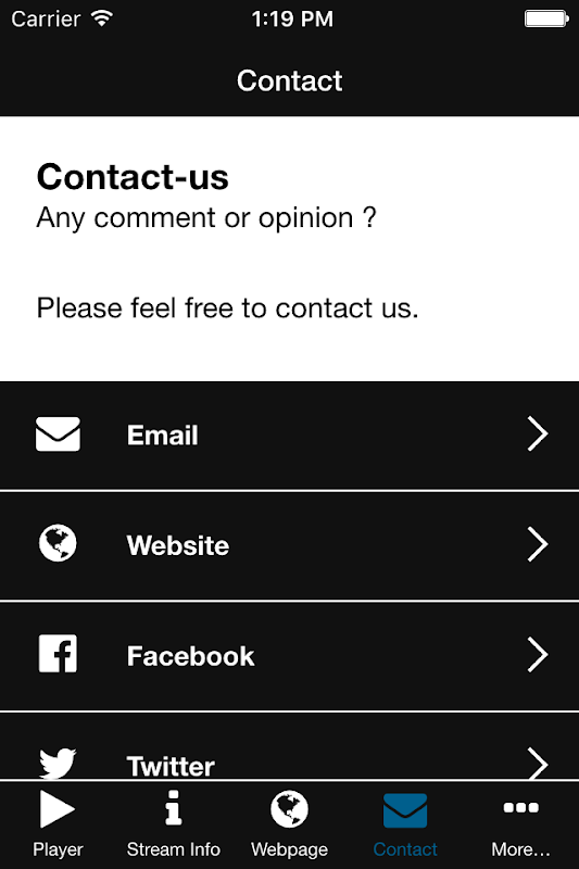 There is a player for each stream, with track and artist details from Last.fm, Facebook and Twitter integrations to the station, "Stream info" page with map of listeners. Artist biography for each stream and every track played. Links to the website.