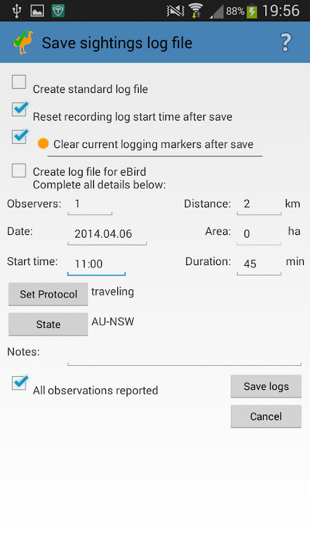 - export log file in eBird Import format for rapid loading of your sightings to eBird