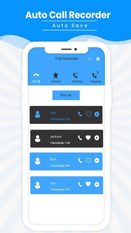 Call Recorder ist eine kostenlose und benutzerfreundliche App für automatische Telefonaufzeichnungsgeräte, mit der Anrufe von beiden Seiten jederzeit in hoher Qualität aufgezeichnet werden können. Es ist der beste Recorder für Tonaufnahmen mit hoher Qualität. Es ist einfach und leicht zu bedienen.