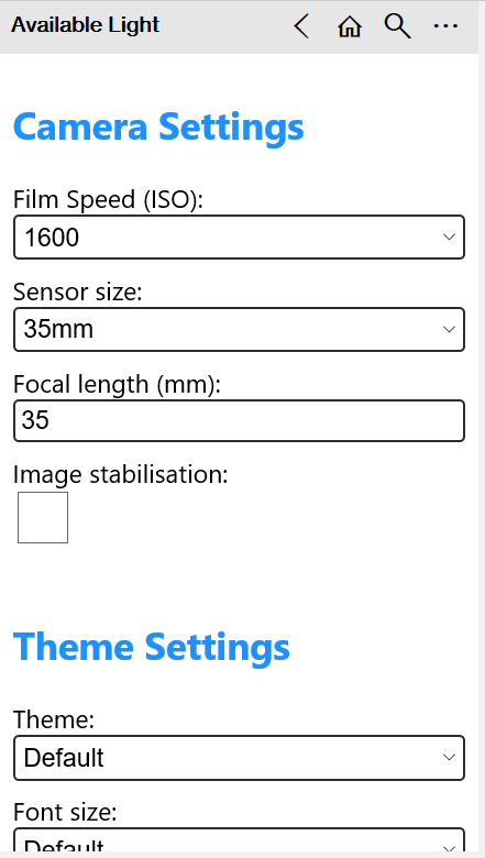 Moderne Kameras verfügen über hervorragende eingebaute Belichtungsmesser. Manchmal kann es jedoch eine Herausforderung sein, Fotos mit verfügbarem Licht (d. H. Ohne Blitz oder andere Fotobeleuchtung) aufzunehmen, insbesondere bei Langzeitbelichtungen bei schlechten Lichtverhältnissen oder sehr intensiver Beleuchtung. Glücklicherweise können Sie unter extremen Bedingungen normalerweise eine Belichtungshilfe wie diese verwenden. Geben Sie einfach Ihre Filmgeschwindigkeit ein, wählen Sie die Lichtverhältnisse aus der Liste aus und sehen Sie eine Tabelle mit Kombinationen aus Verschlusszeit und Blende. Mit dieser Tabelle können Sie eine Kamera mit manueller Steuerung außerhalb der Reichweite des eingebauten Belichtungsmessers verwenden. Die App berechnet auch den Belichtungswert und die Lichtstärke in Lux. Es ist ein einfaches Werkzeug, mit dem Sie unter schwierigen Bedingungen gute Fotos machen können.