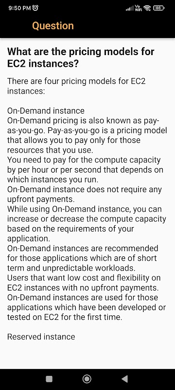 Fragen zu AWS-Interviews: Für diejenigen, die sich speziell für AWS interessieren, enthält unsere App einen speziellen Abschnitt mit über 100 Fragen, die sich auf AWS-Konzepte konzentrieren. Vertiefen Sie Ihr Wissen und stärken Sie Ihr Selbstvertrauen in AWS-Interviewszenarien.