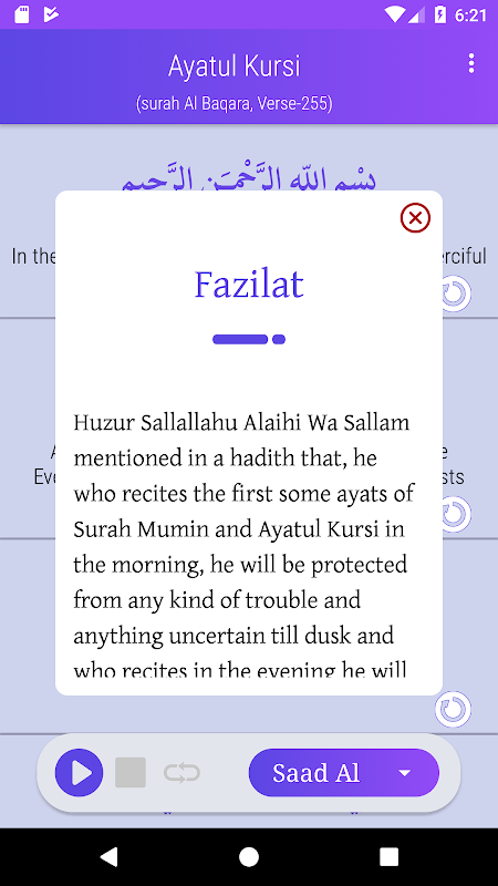 Die Ayatul Kursi Audio App ist eine kostenlose App, in der Sie Ayatul Kursi von einem renommierten Rezitator lernen können. Ayatul Kursi ist eine Ayah der Sure Al-Baqarah (Vers 255). Unser Prophet Muhammad (SM) sagte, es sei die wichtigste Ayah im Koran.