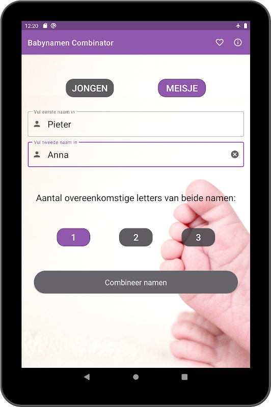 Die Anwendung wird den möglichen Baby-Namen aus einer Datei mit mehr als 20.000 männlichen und weiblichen Namen erzeugen. Alle diese Namen sind in den letzten Jahren auf niederländischen Kindern gegeben. Hoffentlich werden Sie einen schönen Namen für Ihr Baby finden.