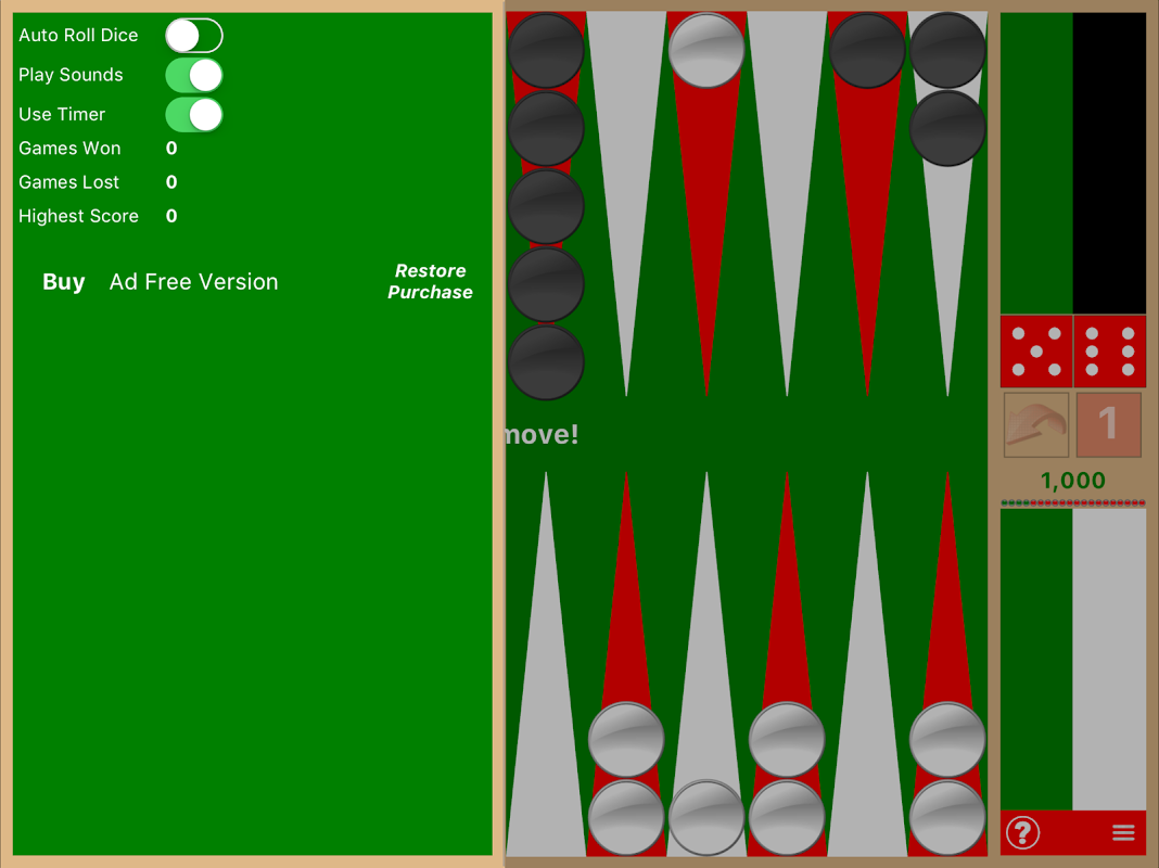 Backgammon-Spielfiguren sind im Allgemeinen als Dame oder Pips bekannt. Das Ziel ist es, alle eigenen Spielsteine vom Brett zu entfernen (abzutragen), bevor Ihr Gegner dasselbe tun kann. Zu Beginn jedes Spiels werden die Damesteine auf vorbestimmte Positionen gesetzt. Im Verlauf des Spiels können sie vom Gegner blockiert oder getroffen werden. Um ein neues Spiel zu starten, tippen Sie auf die Schaltfläche Neues Spiel. Jedes Mal, wenn Sie ein neues Spiel spielen, werden 100 Punkte von Ihrer Punktzahl abgezogen.