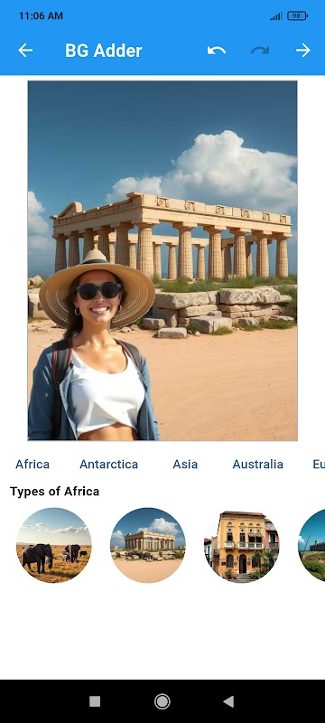 Background Location Replacer ist nicht nur ein Hintergrundwechsler, sondern auch ein vollwertiger Fotoeditor. Die App enthält wichtige Bearbeitungswerkzeuge zur Optimierung Ihres Fotos: