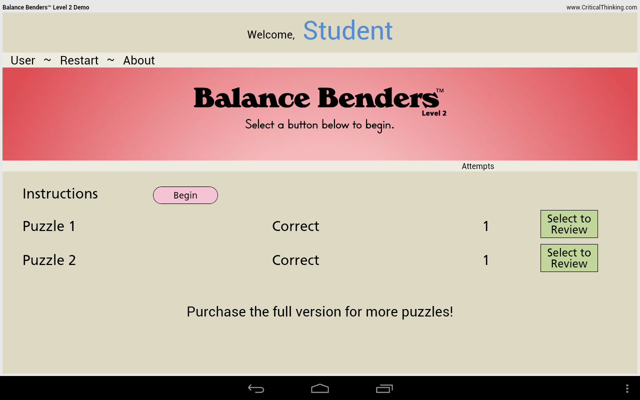 The same quick, fun logic problems as the Balance Benders™ books but now as software! These interactive puzzles give you all the tools you need to work the problem out on-screen before selecting your answer. Developing algebraic thinking used in balancing and solving equations has never been more fun!