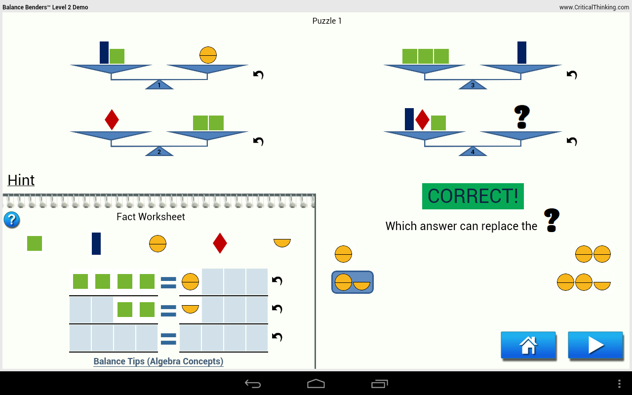 You can use these activities as quick, fun logic problems or as stepping stones to success in algebra. Students develop deductive thinking and pre-algebra skills as they solve balance puzzles! Students must analyze each balance to identify the clues, and then synthesize the information to solve the puzzle. Try one—and then try to stop!
