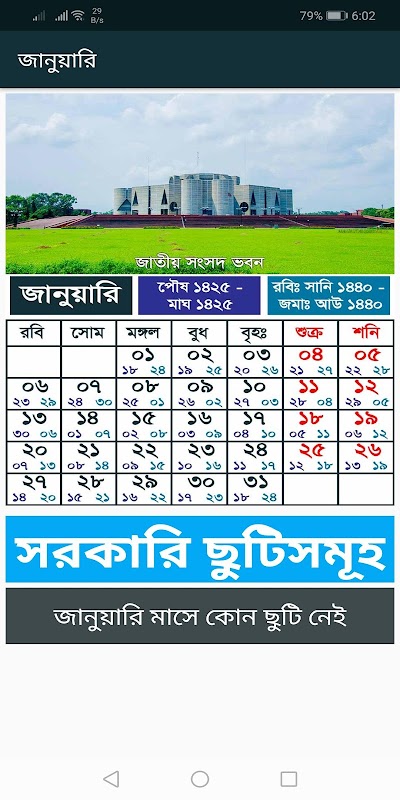 This calendar contains the date of 2019 with government holiday of Bangladesh. It also contain bengali calendar 1425 to bengali calendar 1426 and arabic calendar 1440 to arabic calendar 1441. All this calendar is made for Bangladesh. Only Bangladeshi people should be install this app.