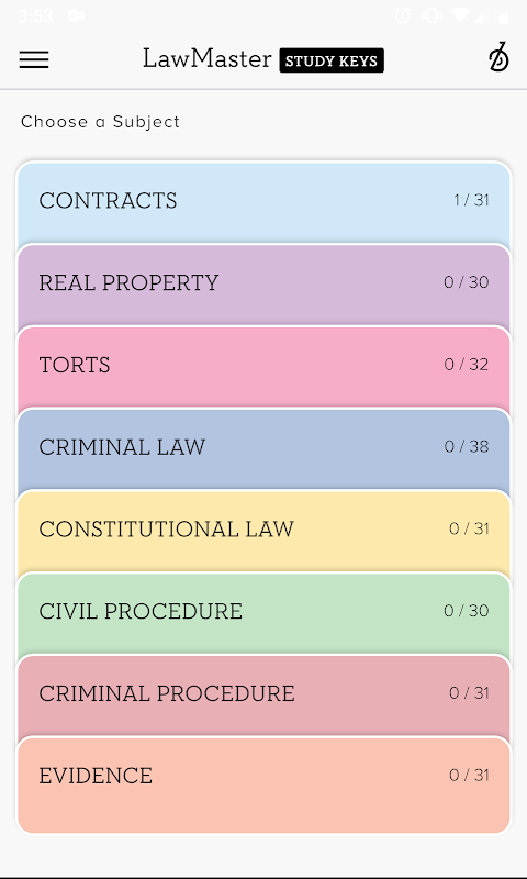 The BARBRI LawMaster Study Keys app is uniquely designed to help you move beyond mere memorization into learning and mastery of the law tested on the bar exam. In the LawMaster Study Keys app, you’ll select the Rules of law within specific subjects and subtopics and identify the correct Elements that comprise that Rule. Lastly, you’ll match the Rule and its Elements to an applicable Story or scenario. Connecting the Rules to the Elements AND applying to an actual Story or scenario is the key to really mastering the law.