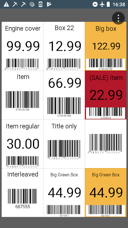 Jedes Etikett kann einen Produkttitel, einen Produktpreis und einen Barcode oder einen beliebigen davon haben. Dort 2 Seitenlayouts.