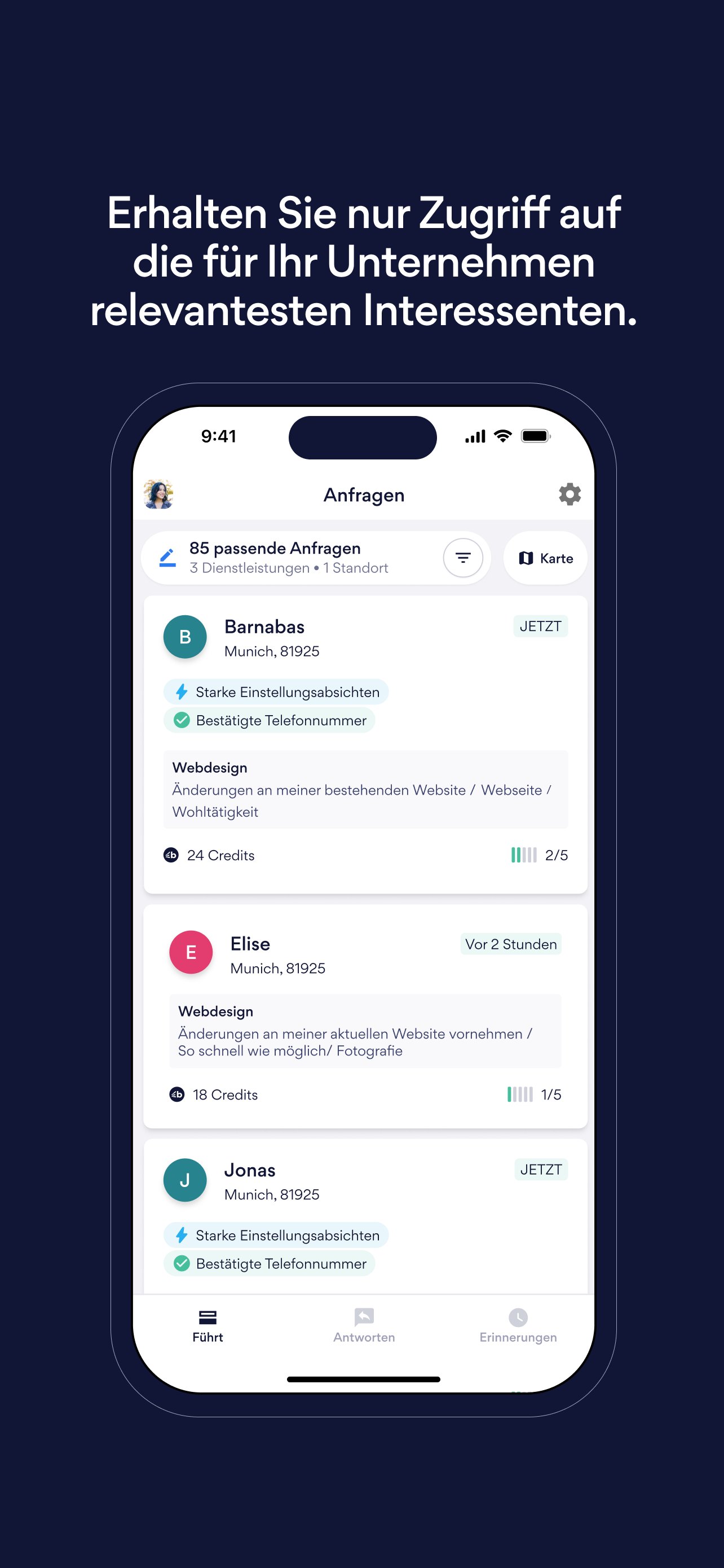 Sie erhalten kostenlos passende Anfragen von Menschen, die aktiv nach Ihren Services suchen. Sie entscheiden selbst, auf welche Aufträge Sie sich bewerben. Keine Provision, keine monatlichen Gebühren – alles, was Sie verdienen, gehört Ihnen.