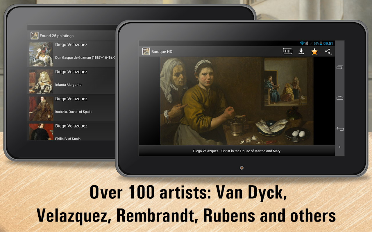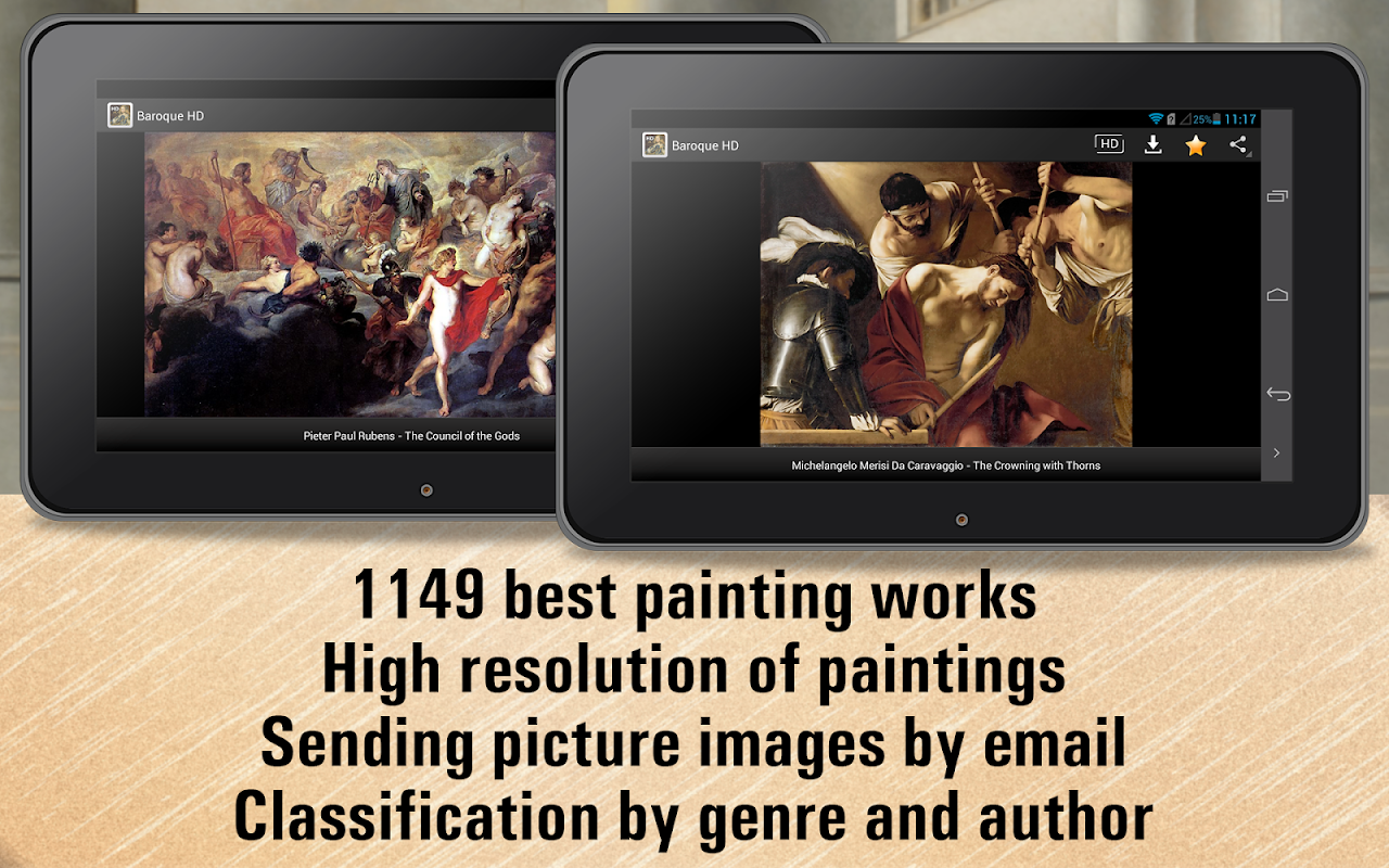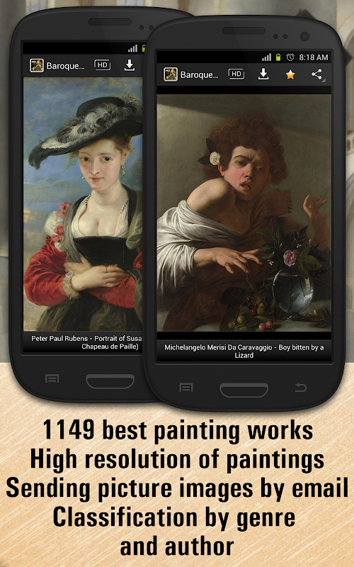 The application contains a great collection of 1149 paintings of 100 different artists - including Michelangelo Merisi da Caravaggio, Peter Paul Rubens, Anthony van Dyck, Rembrandt van Rijn and many others.