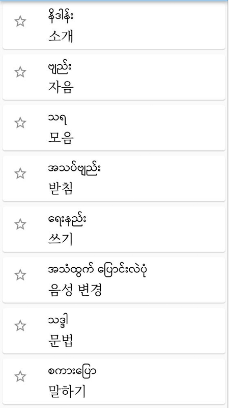 Koreanische Sprache ist sehr systematisch und wir bringen jede Komponente der Lage sein, leicht und effektiv zu lernen. Die App zur Verfügung gestellt den Klang der einzelnen Buchstaben und nehmen Sie mit dem Klang als auch im Zusammenhang Vokabularien zu lernen.