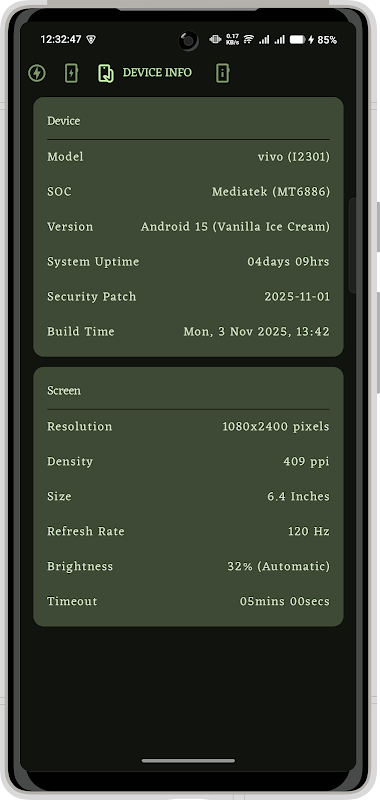 Die App bietet eine einfache Benutzeroberfläche zur Anzeige der Akkuspezifikationen Ihres Geräts, ohne das Systemverhalten zu verändern.