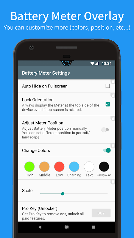 Aufgrund der Sicherheitsverbesserung des Android-Betriebssystems ist es nicht möglich, Batter Meter Overlay über der Statusleiste anzuzeigen. So wird Battery Meter immer unter der Statusleiste angezeigt.