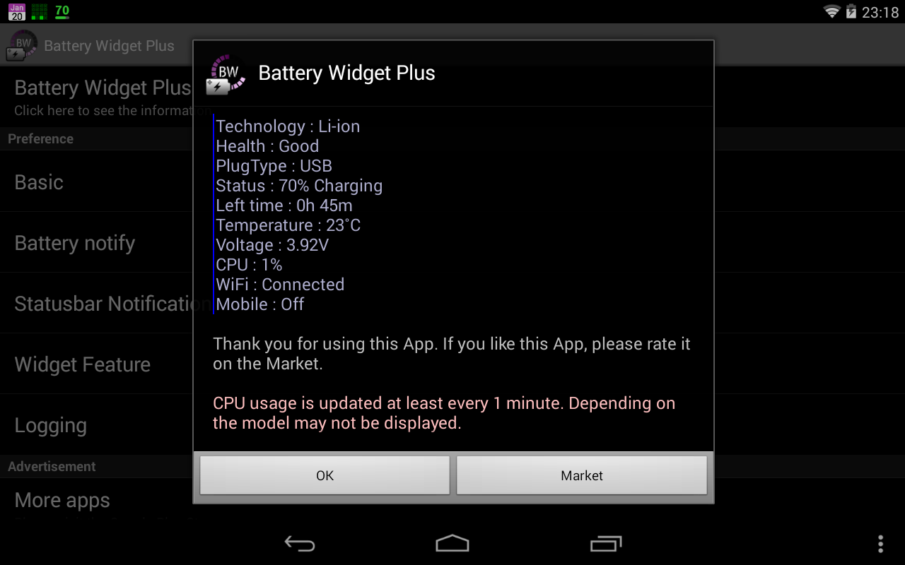 BatteryWidget shows an exact battery level on the status bar, health, temperature, voltage, CPU usage.