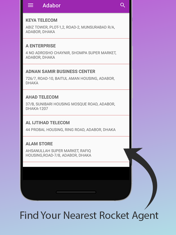 DBBL Rocket Agent Locator - Find your nearest DBBL rocket agent, anywhere in Bangladesh. This app helps you to get DBBL Rocket Agent information in your hand. Very easy searchable app DBBL Rocket Agent Locator consists all DBBL rocket agents information.