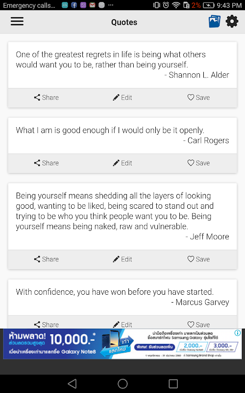 Dies ist eine App, die viele große Zitate über sein selbst speichert. Ich werde auch weiterhin neue Angebote zeitnah hinzugefügt. Es gibt viele Be Yourself-Zitate, dass Sie aus und teilen Sie mit Ihren Freunden lernen können.