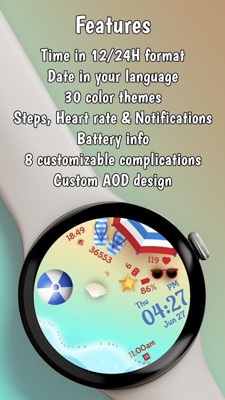 🚀 Neuestes WFF-Format und Wear OS 4 optimiert: Beach Waves wurde mit dem neuesten WFF-Format entwickelt und ist genau auf Wear OS 4 abgestimmt, um eine reibungslose Leistung und minimalen Stromverbrauch zu gewährleisten.