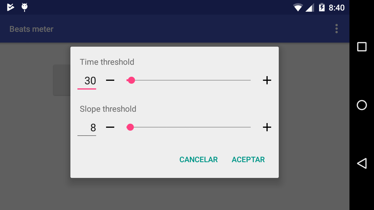 This app allows to calibrate the minimum time in milliseconds between beats to avoid transient pulses and also the minimum stroke strength for a beat to be counted (time and slope thresholds). On each beat detected the app emits a snare drum sound, pay attention for better calibration
