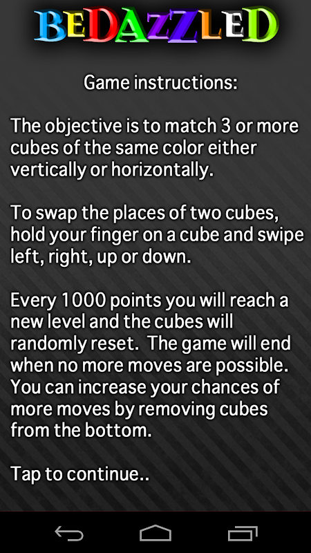 Match 3 or more numbers in a row or column. To swap blocks, swipe a block left, right, up or down. The higher the numbers you eliminate, the more points you get! Reach 1000 points to clear the level and advance to the next board. The game will end when there are no more moves. It will tell you this so you aren't trying to find a match when there are none possible.