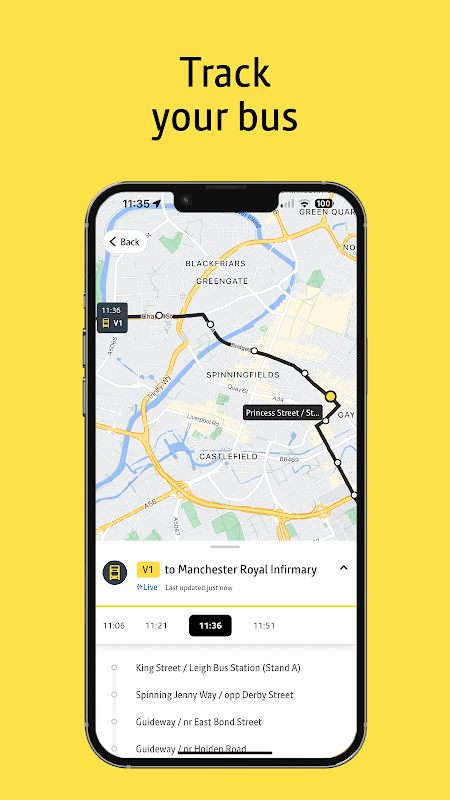 Sagen Sie Gelb zur Bee Network-App, die Ihnen von Transport for Greater Manchester zur Verfügung gestellt wird. Sie können die nächstgelegene Haltestelle finden, die Abfahrtszeiten live abrufen, Ihren Bus verfolgen, eine Fahrt planen und Straßenbahntickets kaufen und nutzen.
