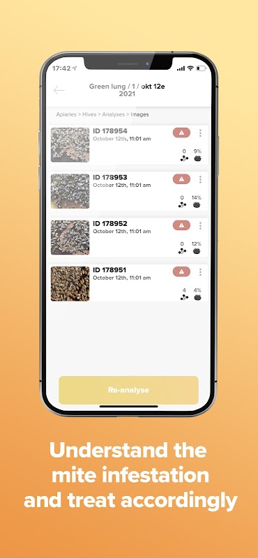 BeeScanning ist eine schnelle, zuverlässige und 100 % bienenfreundliche Methode, um die Gesundheit Ihrer Bienen zu analysieren. Finden und zählen Sie Varroamilben und kranke Brut sofort mit Ihrer Kamera. Die BeeScanning AI analysiert Ihre Bienenbilder in Sekundenschnelle und warnt Sie vor potenziellen Bedrohungen in Ihren Bienenvölkern.