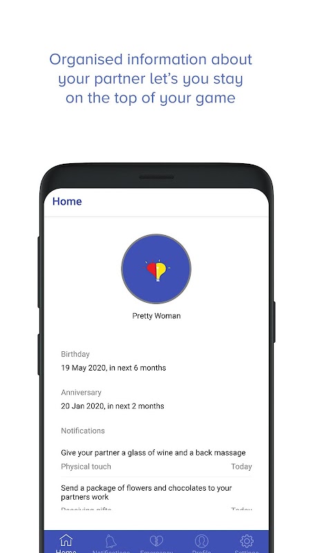 Better Half is designed to help improve your relationship with your partner by providing timely and interesting reminders for things to do with and say to your partner.