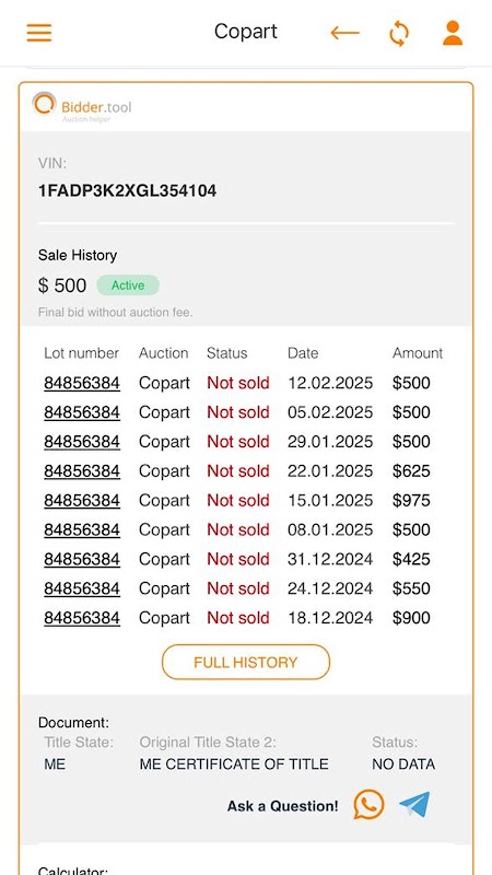 Anzeige der Historie des verkauften Autos: Das Auto wurde zuvor zur Auktion angeboten, der Preis für das Zuschlagsgebot, ob verkauft oder nicht.