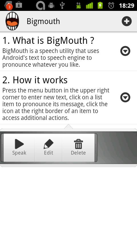 Bigmouth lets Android's text-to-speech engine speak text that you can freely customize. You can store your phrases for easy and fast re-use.