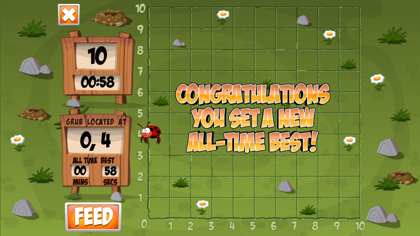 Billy Bug and his Quest for Grub is designed to help children learn how to use coordinates in a fun and engaging way. Make short swipes on the screen to move Billy to the given coordinates. Billy is a greedy little bug and will need to be fed ten times! How quickly can you feed Billy?