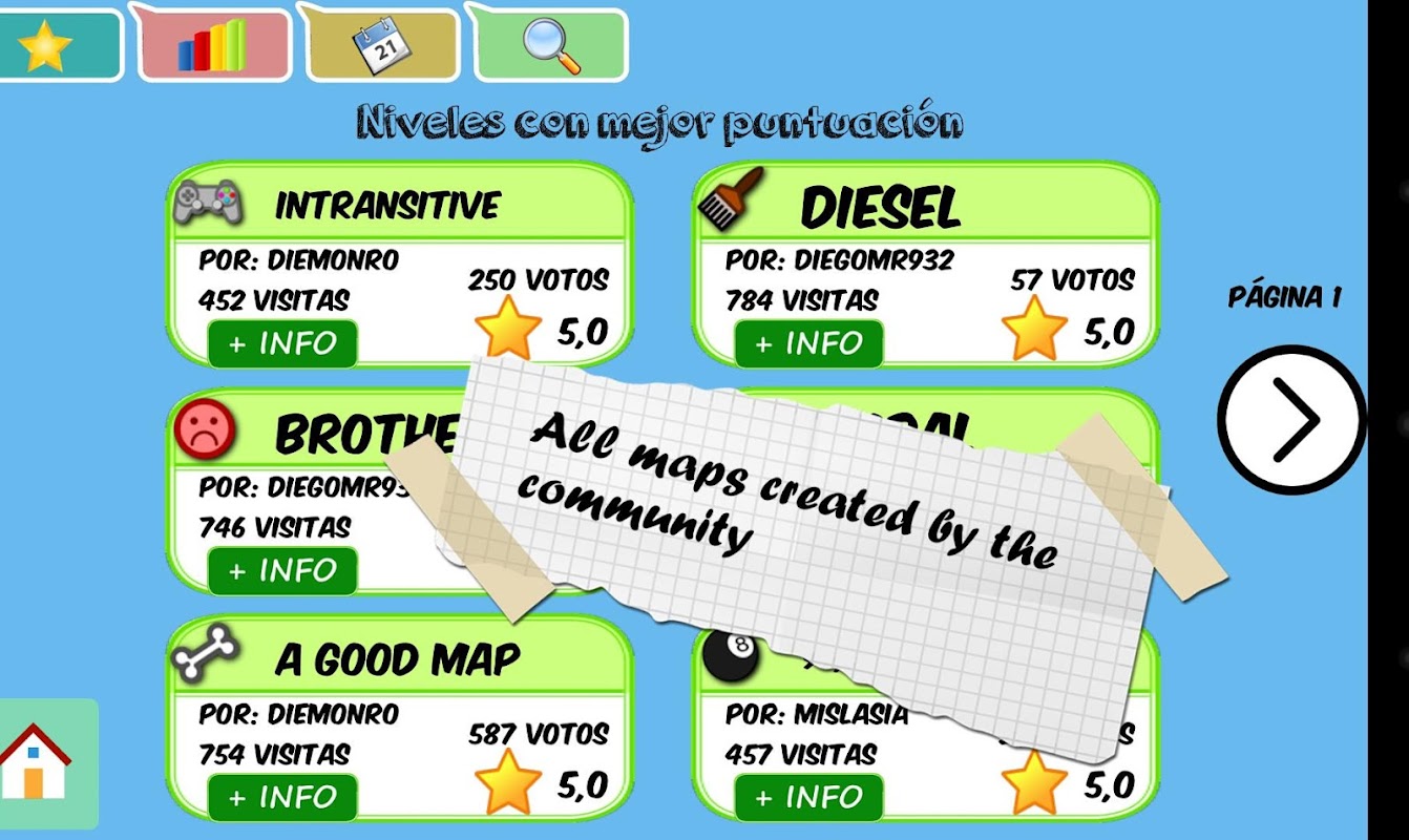 Do you like to create your own levels? We think that the best way to keep active a game is updating it continually. Hereby, anyone can contribute with all the maps that he wants in order to create a huge community of maps.