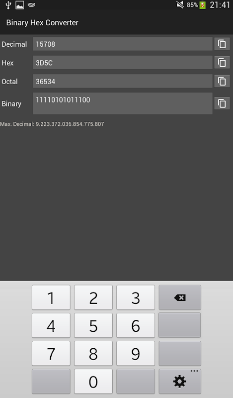Binary Hex Converter is an easy to use app which enables you to convert binary, hexadecimal, decimal, binary and octal numbers automatically while you typing the number.