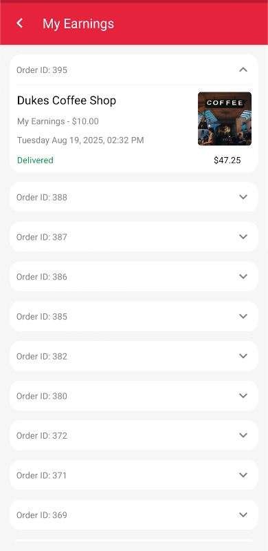 Verfolgen Sie Ihre abgeschlossenen Bestellungen, sehen Sie sich Ihre Gesamteinnahmen an, überwachen Sie Prämien und greifen Sie direkt in der App auf Ihren Zahlungsverlauf zu. Behalten Sie dank transparenter Einblicke die Kontrolle über Ihr Einkommen.