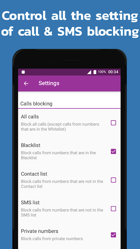 * Block Anrufe und Block-Textnachrichten mit schwarzer Liste.
