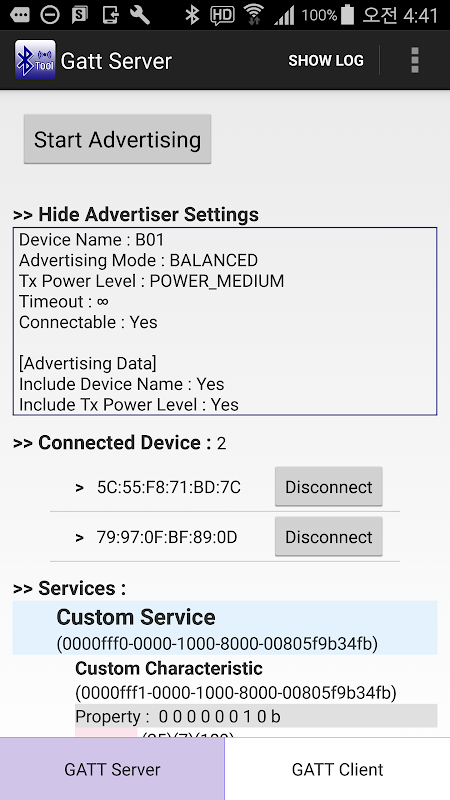BLE (Bluetooth Low Energy) Test-App. Diese App kann ein GATT Server oder Client sein.