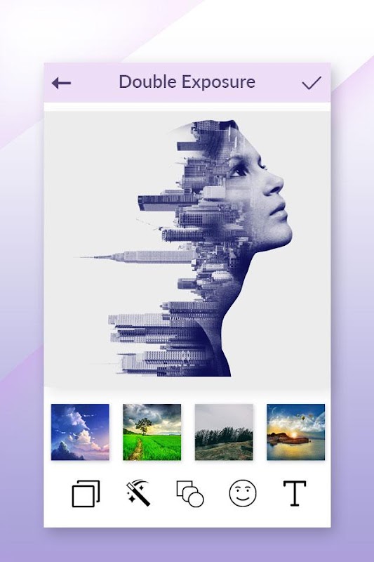 Double Exposure allows you to blend two photos together to create a double exposure effect! You just need to pick pictures or take photos.