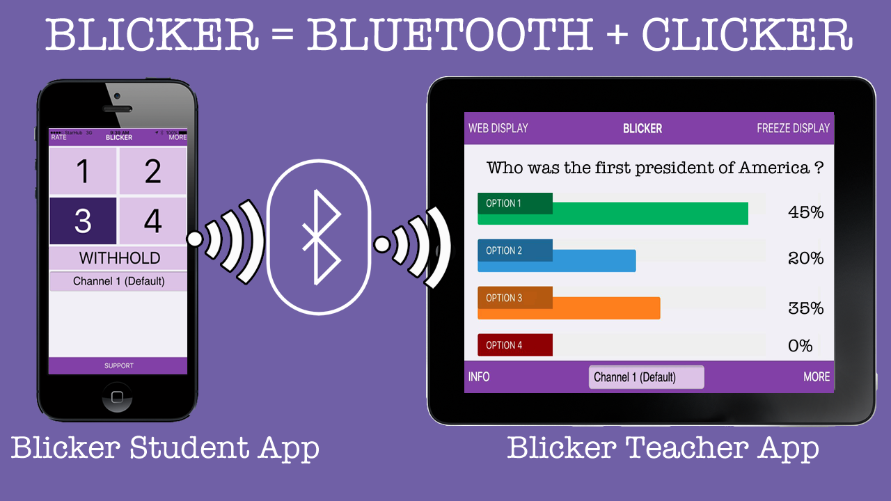 All the student needed is to download the Free Blicker Student App. The app uses the new Bluetooth Low Energy Technology to transmit small data packets containing the student selected responses into the air. As there is no setup or any internet connectivity needed, all the student would need to response is to tap on their desired responses and the Blicker Teacher App will immediately show all the consolidated results in a simple bar chart.