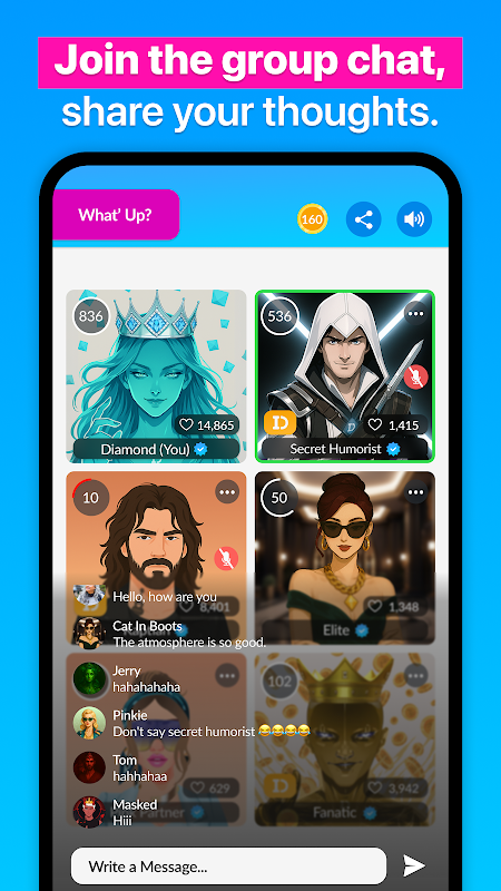 Treffen Sie sich sofort und verbinden Sie sich über Live-Sprache, Gruppenchats und Chatrooms.