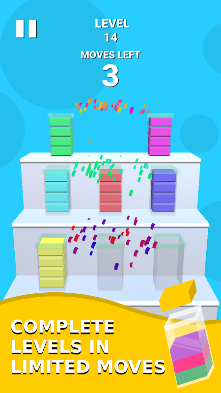 Block Sort 3D ist ein einfaches, aber süchtig machendes Farbsortierpuzzlespiel für Kinder und Erwachsene. Es ist ein anspruchsvolles Spiel, da du das Ziel mit einer begrenzten Anzahl an Zügen erreichen musst. Block Sort It 3D ist ein Blocktausch-Farbsortierspiel, mit dem du dein Gehirn trainieren und deinen Verstand schärfen kannst.
