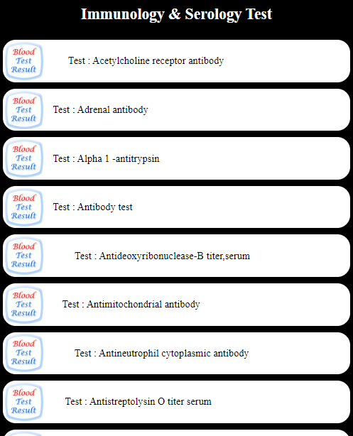 Umfasst Labore aus den Bereichen Biochemie, Hämatologie (Hämatologie), Immunologie, Toxikologie, Mikrobiologie, Virologie und Genetik sowie gängige Bildschirme aus den Bereichen Neurologie, Atemwege, Rheumatologie, Endokrinologie, Kardiologie, Gastroenterologie und Onkologie.