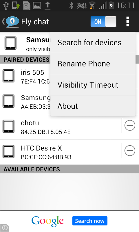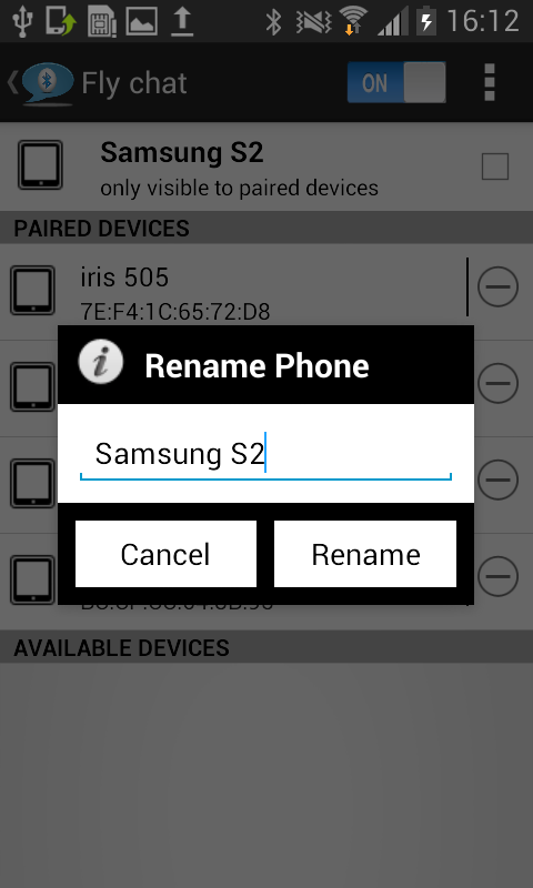 Along with Chatting ,This Bluetooth Chat application supports all basic functionality of a Bluetooth such as Transfer of Media Files(Audio,Video,Images,Contacts) , Managing List of Paired and available devices,Renaming your Device,Searching for Discoverable Devices and changing Visibility Timeout Features.