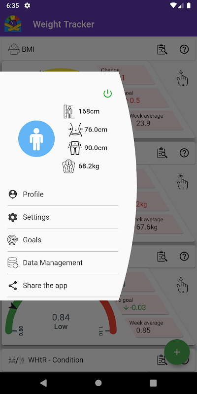 Die kostenlose BMI-Rechner- und Gewichts-Tracker-App überwacht Ihr Gewicht, Ihre Taille und Ihre Hüften. Es berechnet Ihren Body-Mass-Index, das Verhältnis von Taille zu Hüfte und das Verhältnis von Taille zu Körpergröße. Die App liefert außerdem Referenzwerte für jedes der berechneten Maße – BMI, WHR und WHtR –, sodass der Benutzer seinen Gesundheitszustand schnell erkennen kann.