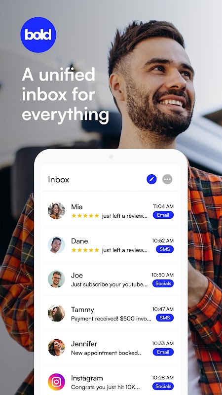 Bold ist die All-in-One-Messaging-Plattform, mit der Sie Leads in Kunden umwandeln können, indem Sie die Leistungsfähigkeit von SMS-Nachrichten nutzen. Mithilfe fortschrittlicher KI-Technologie können Sie über intelligente SMS-Nachrichten Bewertungen anfordern, Rechnungen ausstellen und sogar Termine für Kunden vereinbaren.