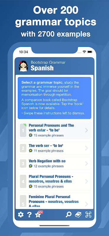 Ein Begleitbuch mit dem Titel „Bootstrap Spanish Grammar“ ist jetzt erhältlich. Das Buch enthält alle in diesem Buch enthaltenen Inhalte – darunter 209 Grammatikthemen und über 3.700 Beispielphrasen.