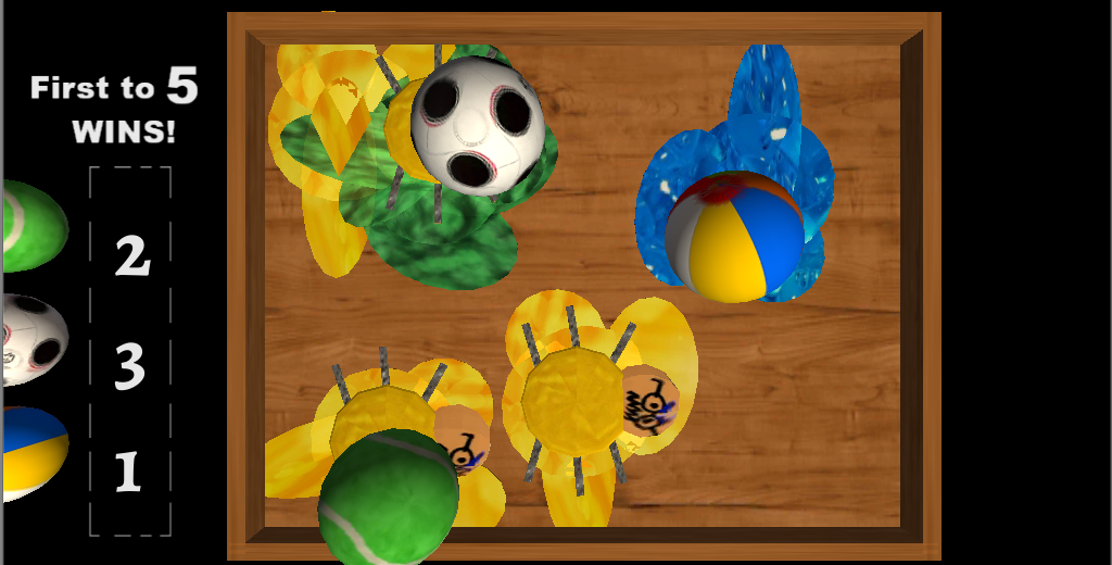 Beach ball, Soccer ball, and Tennis ball face-off in a contest to see who can be the first to squish silly bugs.