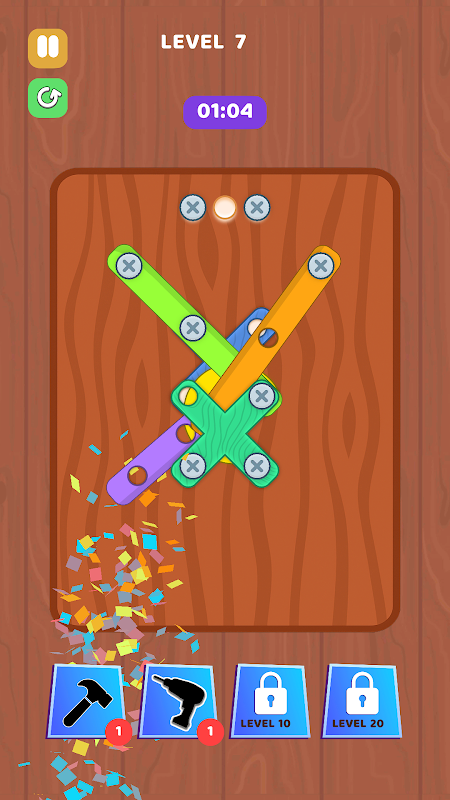 Jedes Level ist ein kleines mechanisches Rätsel: Bunte Bretter sind mit Schrauben befestigt und blockieren sich gegenseitig. Deine Aufgabe ist es, die richtige Reihenfolge zum Lösen, Verschieben und Entfernen der Schrauben zu finden.