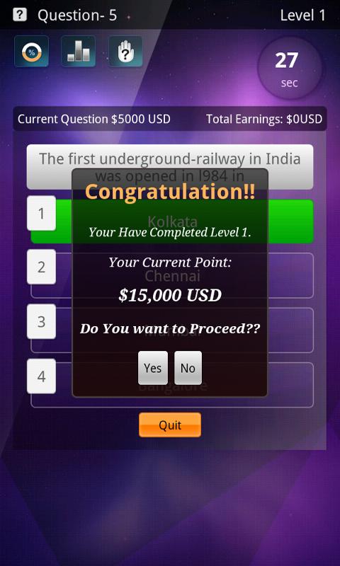 Es ist ein Quiz-Spiel basiert auf der beliebten TV-Shows. Es hat eine ziemlich große Sammlung von Fragen, die nach dem Zufallsprinzip für den Benutzer zu beantworten angezeigt. Es beinhaltet Funktionen wie Ebenen-Quiz, Lebenslinien, Punkten usw. Mehrere Benutzerkonten erlaubt sind, den Wettbewerb in geschlossenen Benutzergruppen erleichtern und den Vergleich der Ergebnisse der einzelnen Benutzer. Eine schöne Erfahrung, einen Versuch wert.